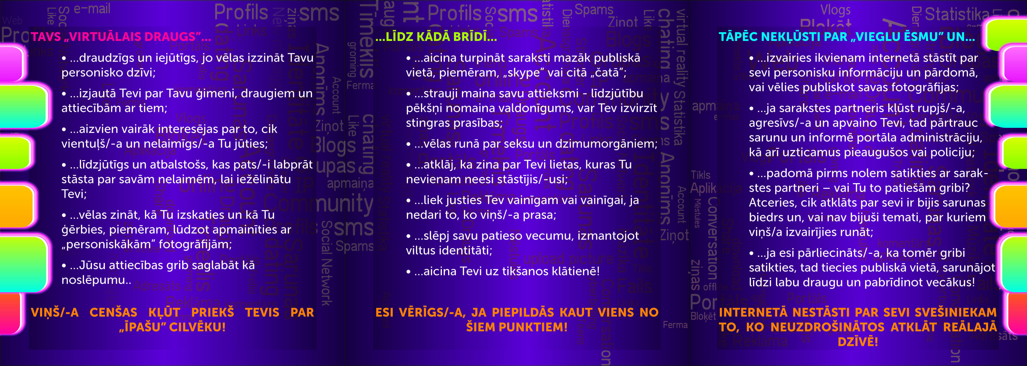 „Daži padomi, kā nekļūdīties, sarakstoties internetā” ir informatīvs materiāls, kas sniedz informāciju par iespējām izvairīties no pāridarījumiem un noziedzīgām darbībām internetā un saglabāt personisko drošību.