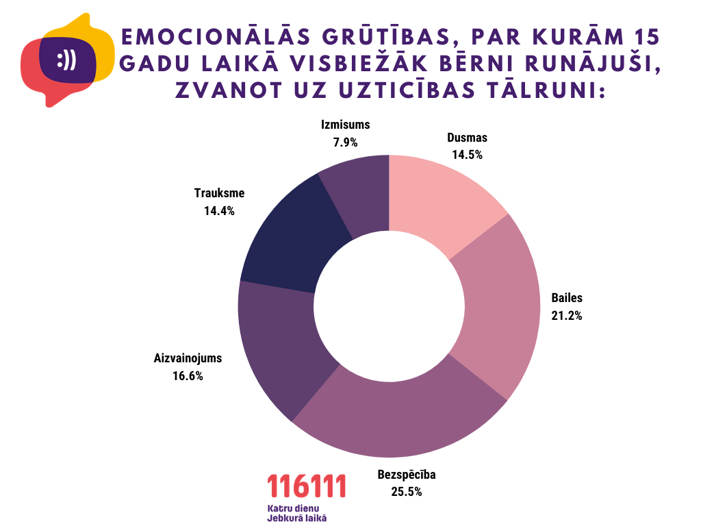 Pielikumā esošā infografika attēlo bērnu un pusaudžu emocionālās problēmas, par kurām visbiežāk zvanus saņem tālruņa konsultanti - psihologi.