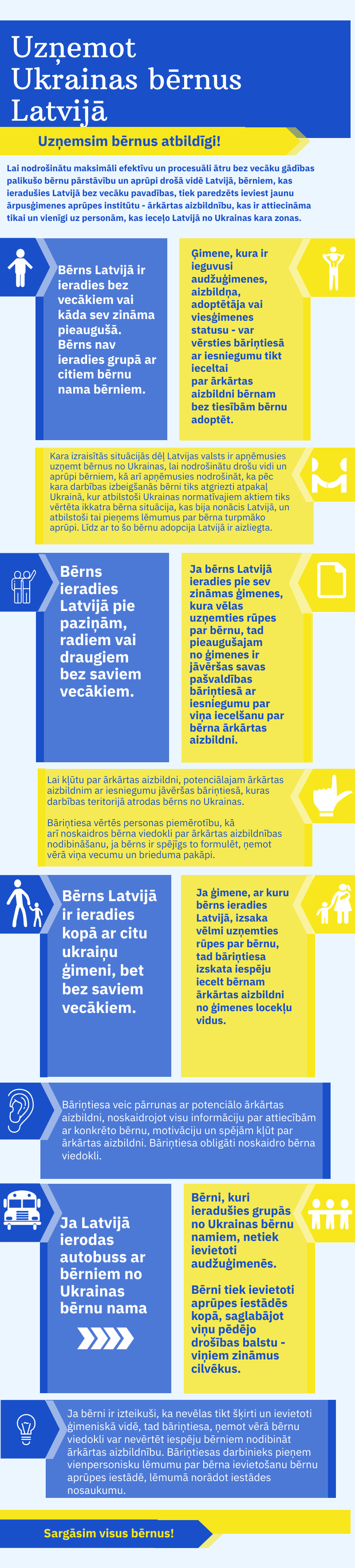 Likumprojekts paredz ieviest jaunu ārpusģimenes aprūpes institūtu - ārkārtas aizbildnību, kas ir attiecināma tikai un vienīgi uz bērniem, kas ieceļo Latvijā no Ukrainas kara zonas. Savukārt gadījumos, ja Latvijā ierodas nepavadītu bērnu grupa no Ukrainas bērnu aprūpes iestādēm un bērni izteikuši vēlmi tikt izvietotiem Latvijā vienkopus un nav iespējams nodibināt šiem bērniem ārkārtas aizbildnību, bērnu aprūpi nodrošina iestādē. Likumprojektā ietvertā procesa aprakstam Labklājības ministrija ir izstrādājusi infografiku, ar ko var iepazīties, lejuplādējot pielikumu.