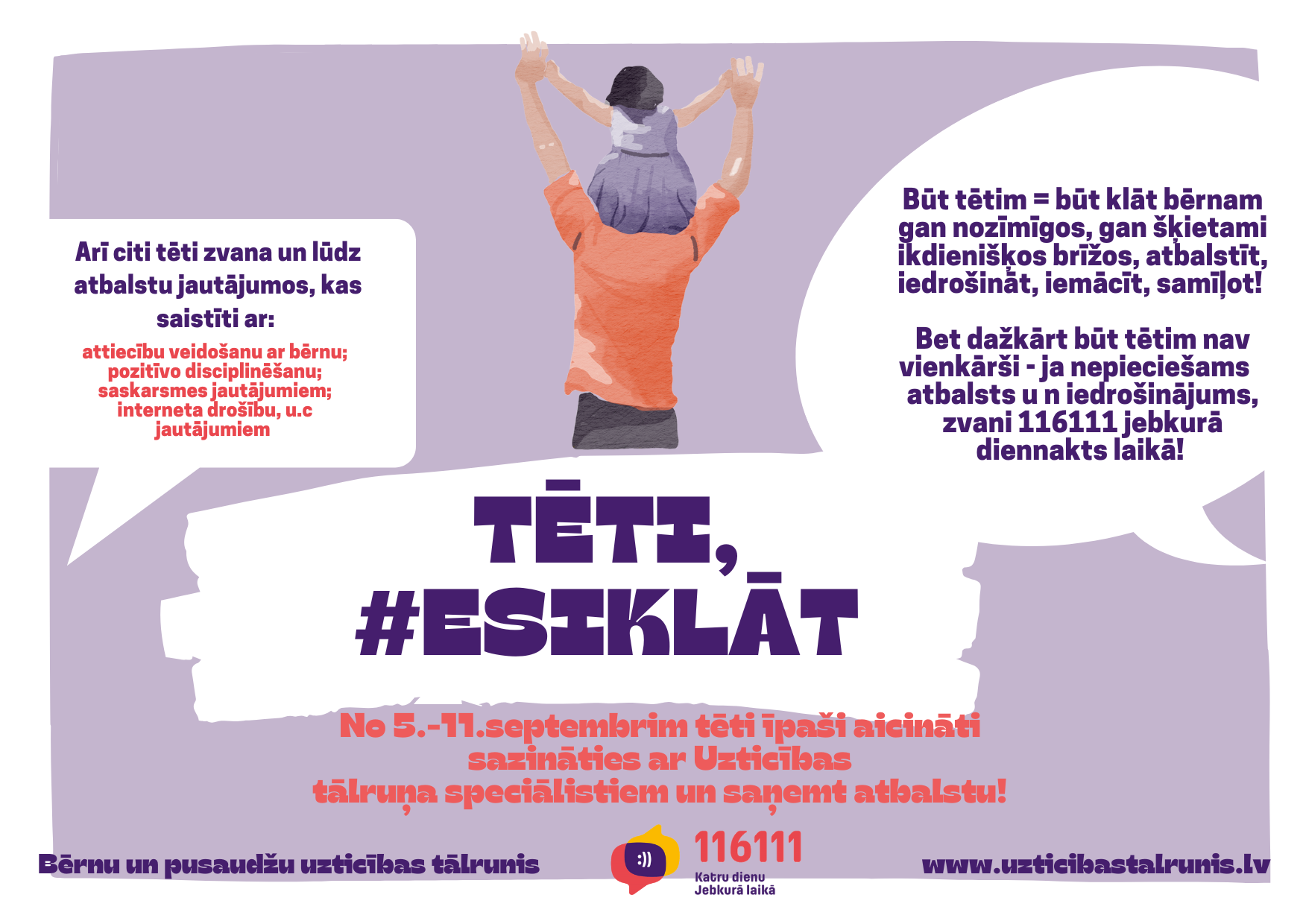 Par nozīmīgu tradīciju Latvijā kļuvusi Tēva diena, tādēļ arī šogad Valsts bērnu tiesību aizsardzības inspekcijas Bērnu un pusaudžu uzticības tālrunis 116111 (turpmāk – Uzticības tālrunis) rīko kampaņu tēvu atbalstam “Uzticības tālrunis tēviem”. Kampaņa noris no 5.-11. septembrim.