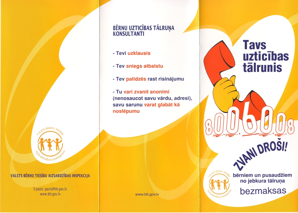 Šajā informatīvajā materiālā pusaudži var uzzināt, ka pa tālruni 8006008 viņus uzklausīs konsultanti, kas sniegs atbalstu un palīdzēs rast risinājumu dažādās sarežģītās situācijās un grūtībās, ar kurām viņiem nācies saskarties.